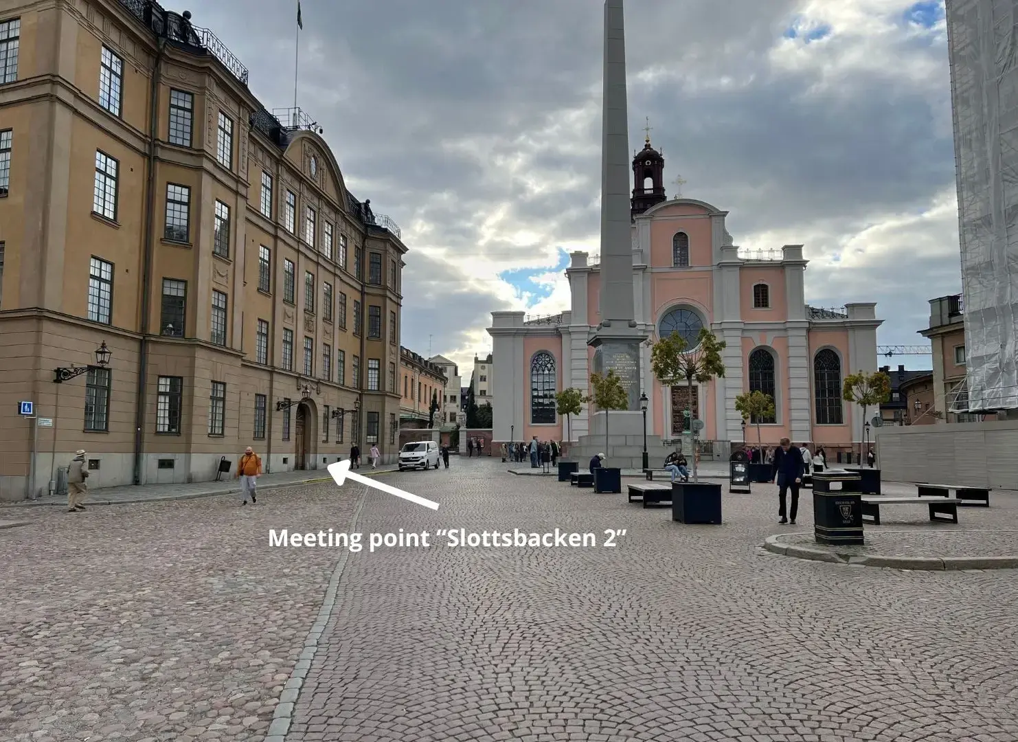 The meeting address is Slottsbacken 2, opposite the high Gustaf III Obelisk. The guide will stand on the right hand of the entrance wearing a round company badge - "Gamla Stan Sightseeing". If you are unable to locate your guide, kindly refer to photo number 2, which is clearly marked with “Meeting Point.”