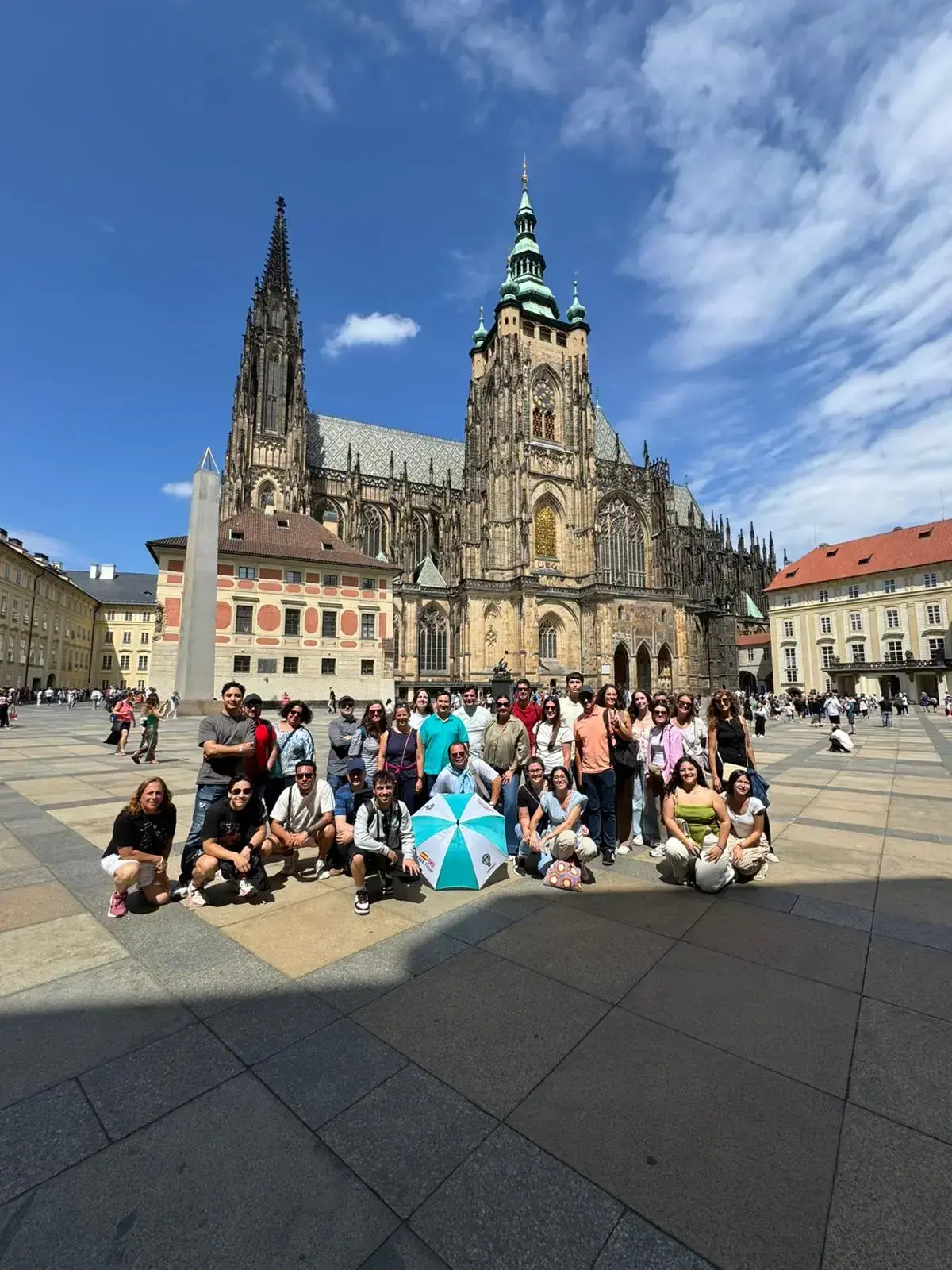In front of the Rudolfinum building with WHITE AND LIGHT BLUE umbrellas