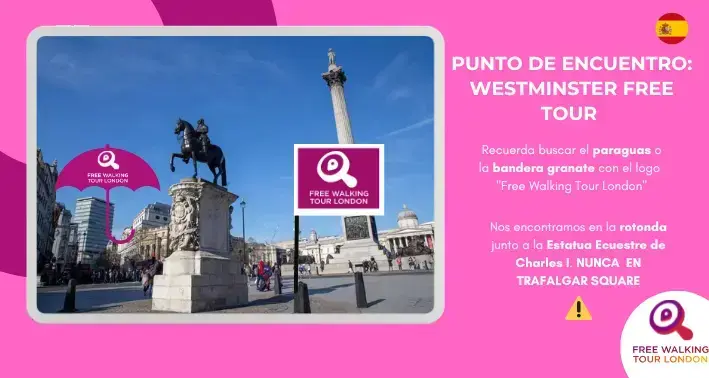 By the Equestrian Statue of Charles I, with a PURPLE flag ☂.