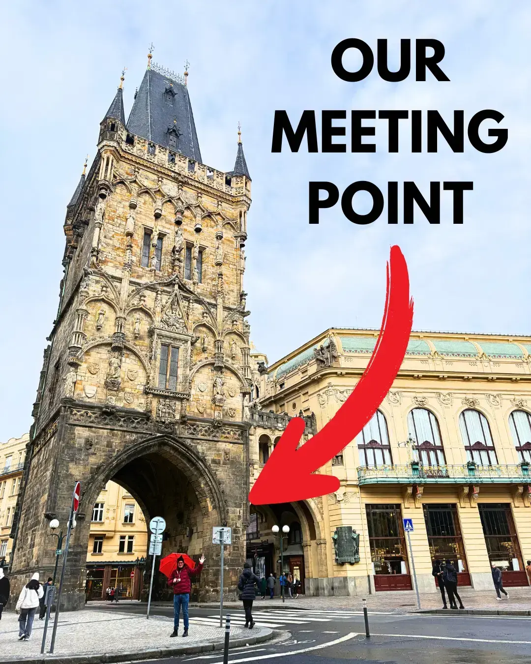 In front of the Powder Tower, look for a red umbrella with big white "100" written on it