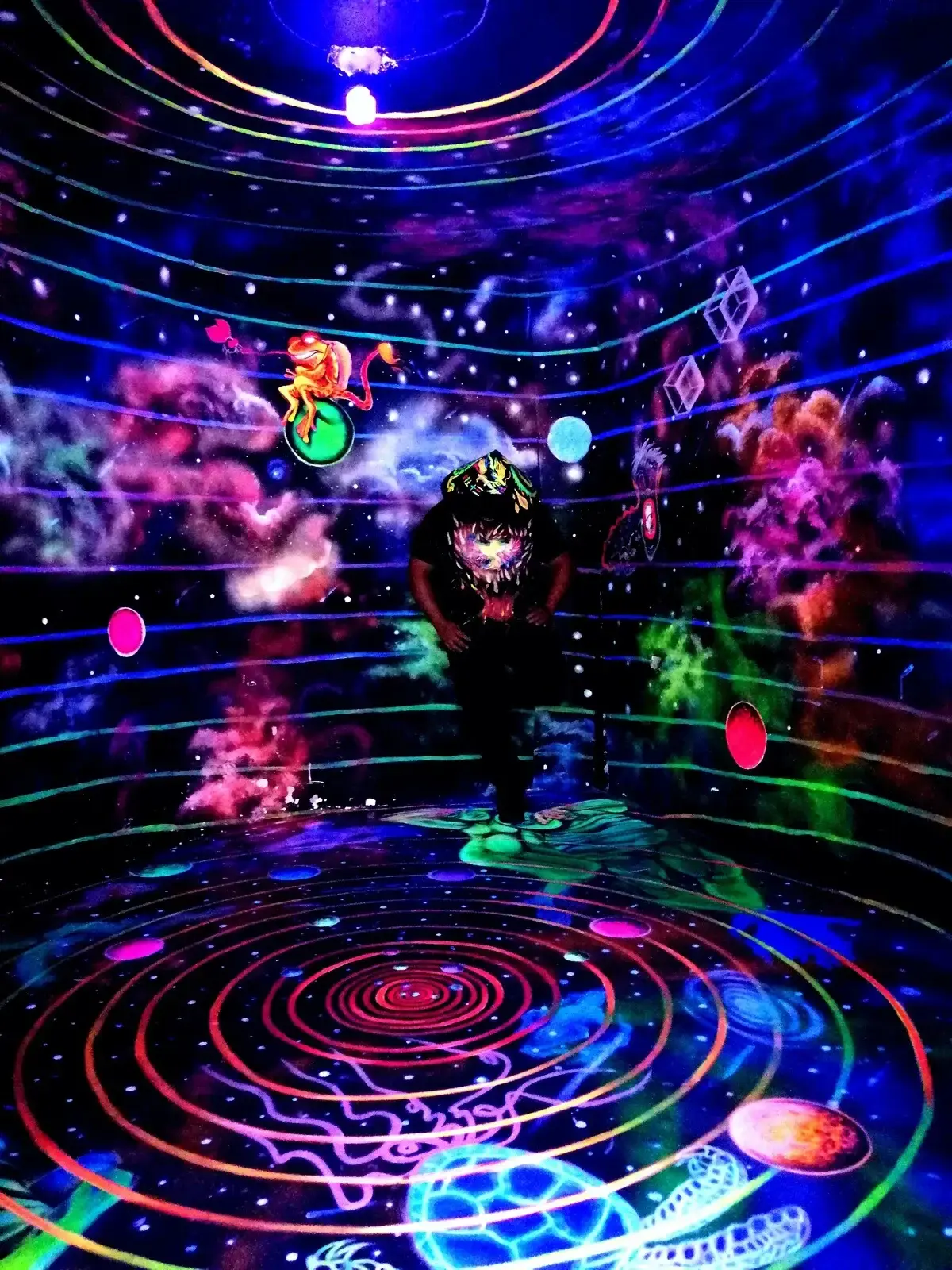 I will be in front of the mural of a mandala that says LIFE I will be with a black hat