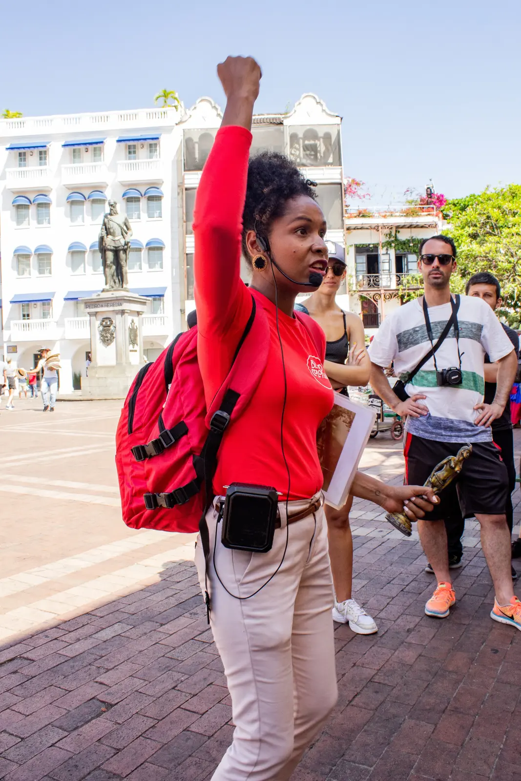 In Santo Domingo Square next to Botero’s sculpture “Gertrudis” with our RED UMBRELLAS! (Maps: https://maps.app.goo.gl/VkQDkrgP9rS3siG58)